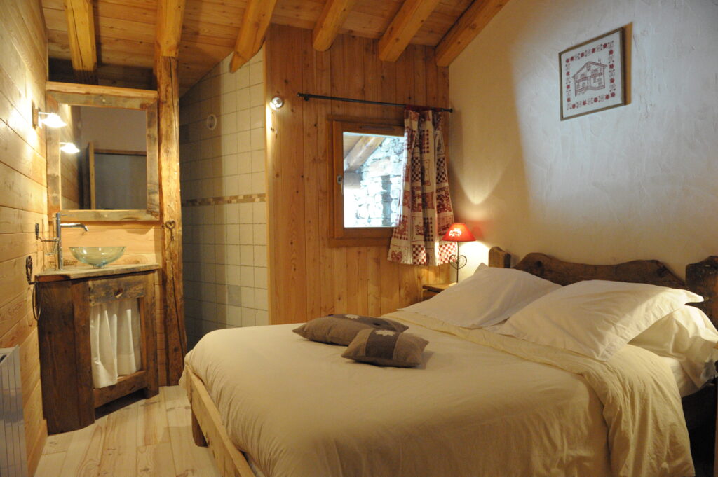 À l’étage, sous la charpente apparente, l’ambiance se fait plus intime. Une chambre double avec salle d’eau (douche et vasque), une chambre double avec balcon, et une chambre familiale (un lit double et un lit simple, avec balcon) offrent un confort douillet pour tous les hôtes. Une salle de bain complète avec baignoire, douche et vasque, ainsi qu’un WC indépendant, viennent compléter l’étage.
